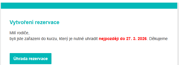 Nově můžete kurzovné uhradit pomocí tlačítka Úhrada rezervace, které naleznete ve Vaší e-mailové schránce. Tento e-mail Vám zasíláme při Vytvoření rezervace na kurz.